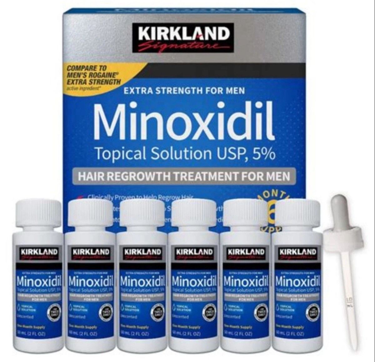 O Minoxidil Kirkland é uma solução tópica de 5% desenvolvida especialmente para homens que buscam combater a queda de cabelo e estimular o crescimento capilar. Esta caixa contém 6 frascos, oferecendo um suprimento de 6 meses para um tratamento eficaz e contínuo. Comprovadamente clínico, o Minoxidil promove o aumento da circulação sanguínea no couro cabeludo, resultando em folículos capilares mais saudáveis e, consequentemente, em um crescimento de cabelo mais robusto e volumoso.